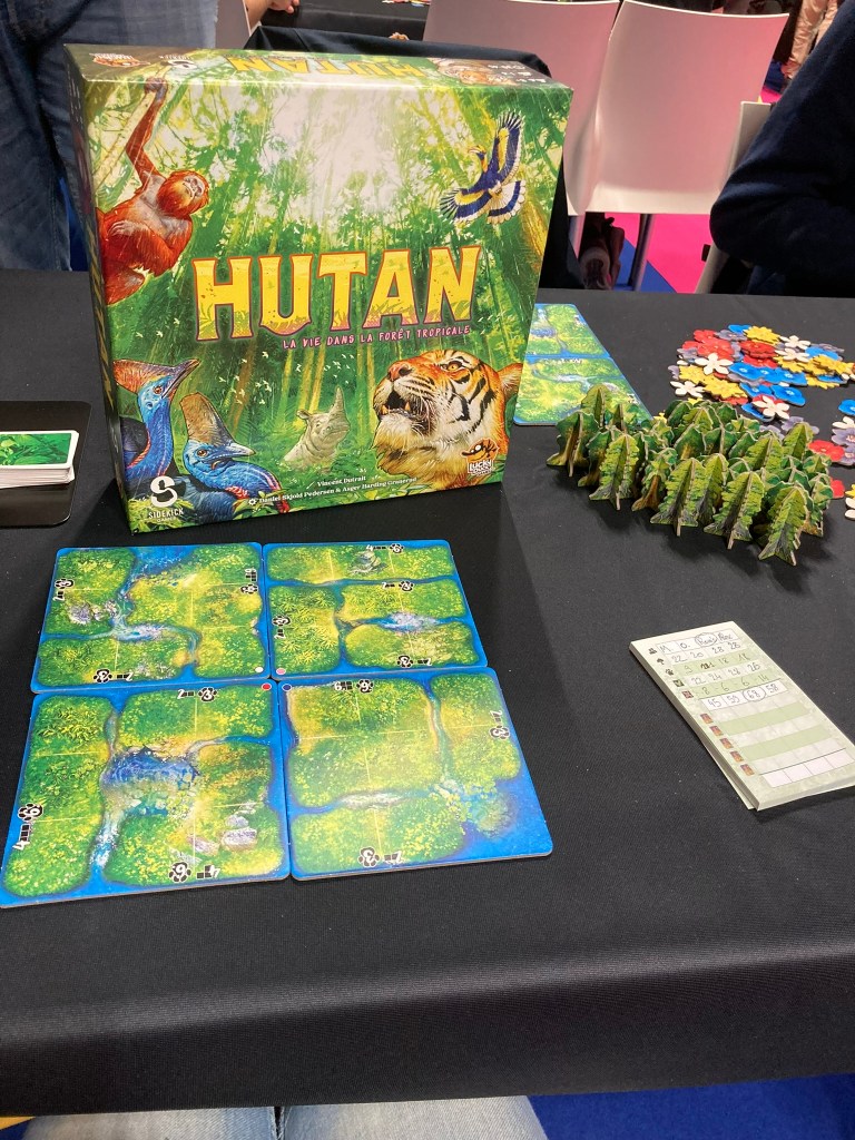Dans Hutan, les joueurs doivent choisir l’une des cartes disponibles et placer les fleurs indiquées sur la carte dans leur jungle en respectant les règles de placement. Lorsque deux fleurs de la même couleur se superposent, le joueur peut planter un arbre, voir un animal si la zone est complète. Mais attention, toutes zones démarrées non complétées en fin de partie seront des points négatifs
