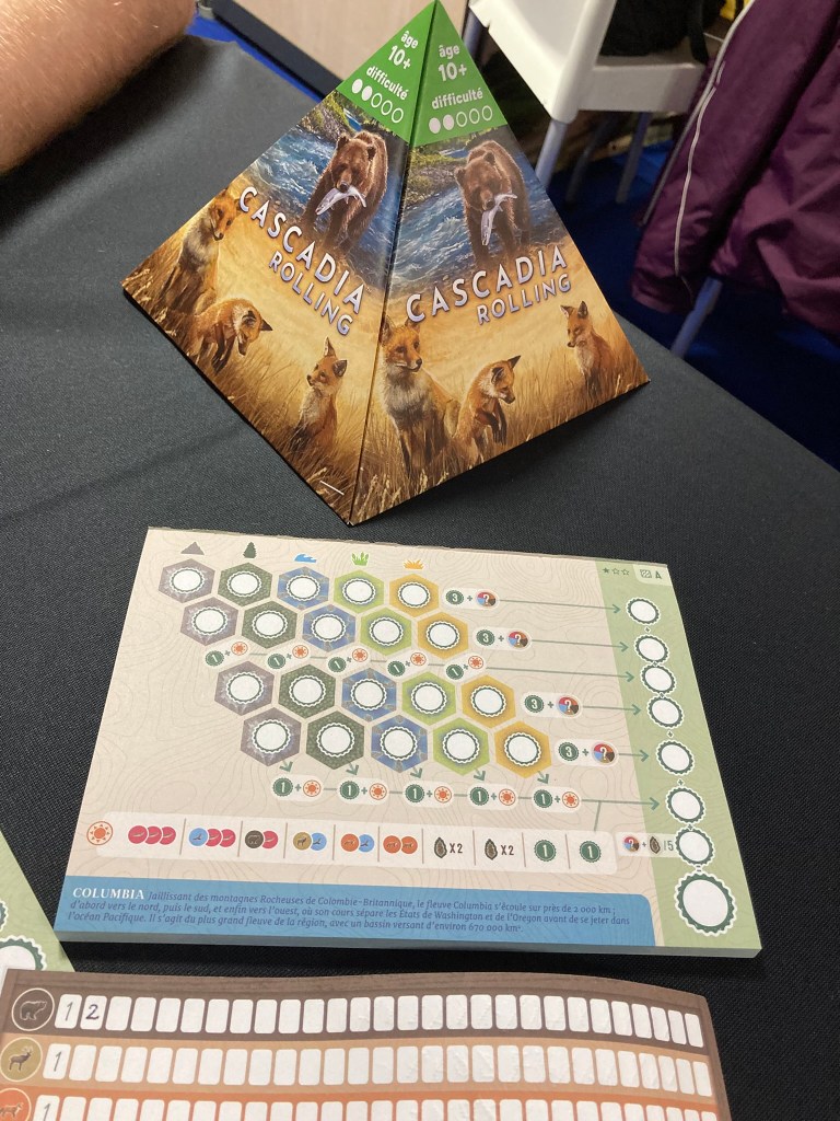 Nous sommes toujours chez Lucky Duck Dames, et nous continuons dans le thème de la nature. Nous avons joué à la version roll & write de Cascadia, avec la boite rivière.